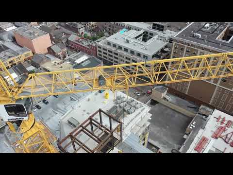 Drone shots from up close, far away, multiple angles and shots showing the crane and the steel beams where it was impacted.